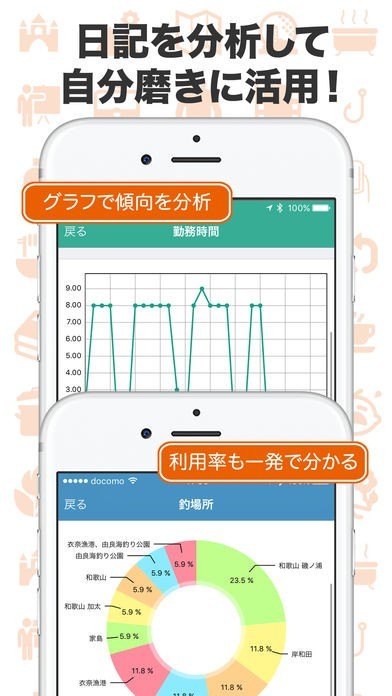 日記を書くだけで、日記をつけた分の期間の行動分析して自分磨きに活用できます。グラフで傾向を分析したり、物事の利用率も円グラフで表示したりするのですぐに確認することができます。