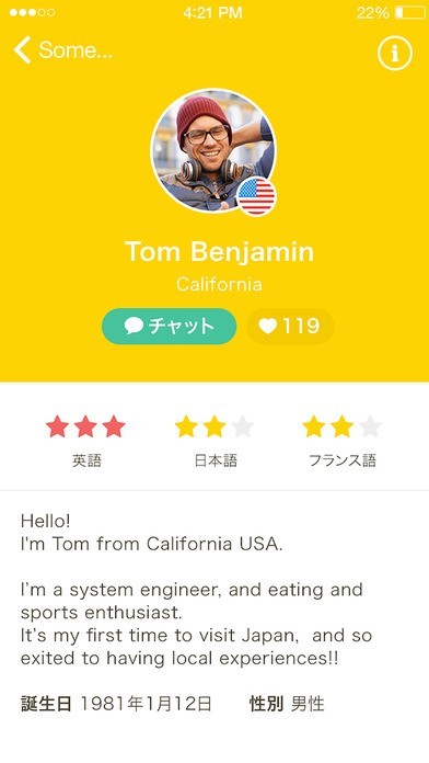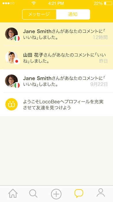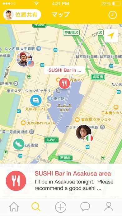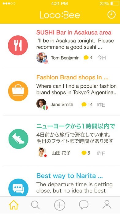 旅人や地元ユーザーとして世界各国での交流を楽しめるコミュニティツール「LocoBee」 食事やオススメなどの4つのカテゴリーに分けてユーザーの投稿を表示し、欲しい情報をすぐに閲覧できるようになっています。 隠れた観光スポットや地元ならではの料理も手軽にチェックできるのが嬉しいポイント。 マップ機能も用意されており、マップ上にはユーザーやおすすめスポットなどを掲載しています。 気になるスポットを見つけたら、タップで詳細を確認してみましょう。 また、「Loco」と呼ばれる地元ユーザーとしての投稿も可能。 プロフィール機能には自分の情報とともに、対応できる言語なども記載できます。