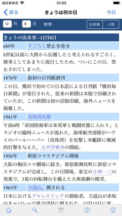 「きょうは何の日?」では任意の日に起きた出来事やその日に生まれた人を調べることができます。そこから関連する用語を連続して検索することもできるので知識が広がります。