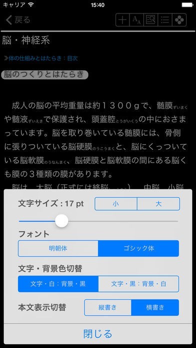 縦書きと横書きを切り替えることができるので、自分が見やすいように表示設定を変更できます。白背景に黒文字だけでなく黒背景に白文字も選ぶことができ、目に優しくなります。