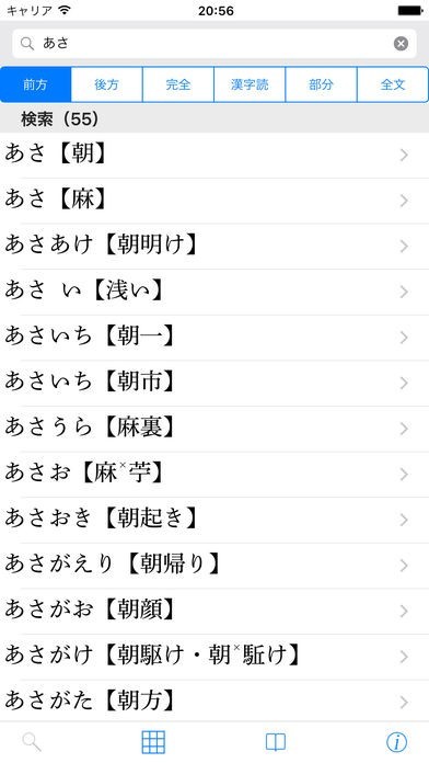 従来の国語辞書のように前方一致での検索ができるのはもちろん、完全一致、部分一致などさまざまな検索方法に対応しており、関連語句をスピーディーにまとめて調べられます。