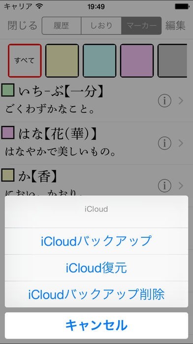 気になった言葉はしおり機能で保存することができ、メモを書き込むことも可能です。iCloudでバックアップしておけば、ほかの端末でもしおり機能を共有することができます。