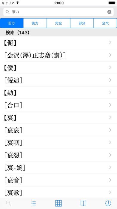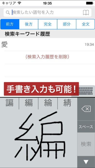 入力した文字によって候補となる漢字が表示されるインクリメンタルサーチや、読み方が分からない漢字を直接入力できる手書き入力に対応しているので、快適に検索することができます。