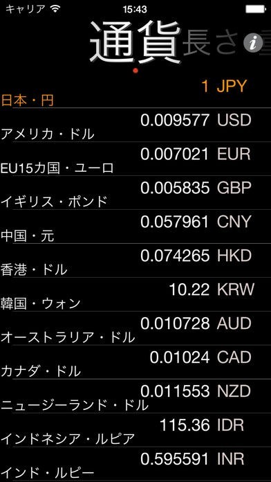 アプリでは基準となる通貨に対する交換レートが一覧表示されます。日本円に設定すれば、1円当たりの外国通貨の価格が表示されます。各国の通貨水準を見比べるのに最適な機能です。