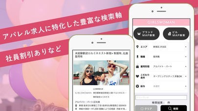 App Storeより引用日本最大級1,400以上のアパレルブランドの求人情報を掲載する「GIRLSWOMAN」の無料公式アプリです。