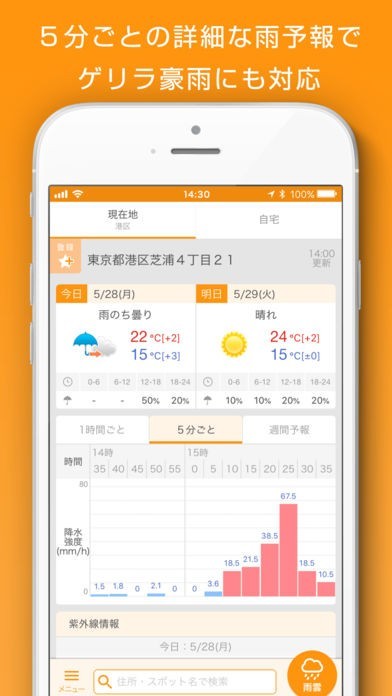 登録地域や現在位置のピンポイントな天気情報が得られるので、洗濯物を干すときや傘の要否の判断に重宝しています。
