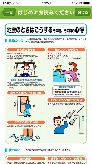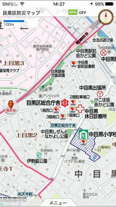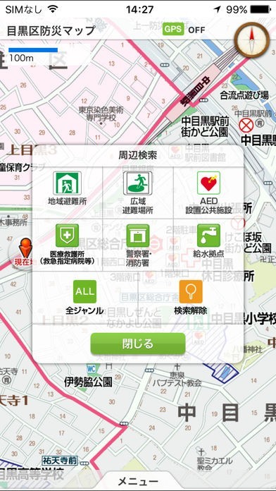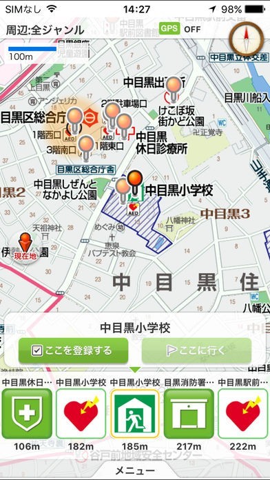 目黒区防災マップは東京都の目黒区防災マップのアプリ版となっており、停電時及び通信回線にダメージがあった災害時にも対応できるよう、現在地表示や目的地登録など地図関連の機能はGPSを使用しておりオフラインでも動作可能となっています。広域避難場所や地域避難所の場所はもちろん、給水可能地点や医療施設、AEDの設置箇所についても記載されています。目黒区在住の方はもちろん、目黒区に通勤・通学されている方には必須と言える機能を持っています。災害時の避難目的地は20箇所登録できるようになっており、地図以外の機能としては災害情報の入手方法や安否情報の確認方法について閲覧できます。