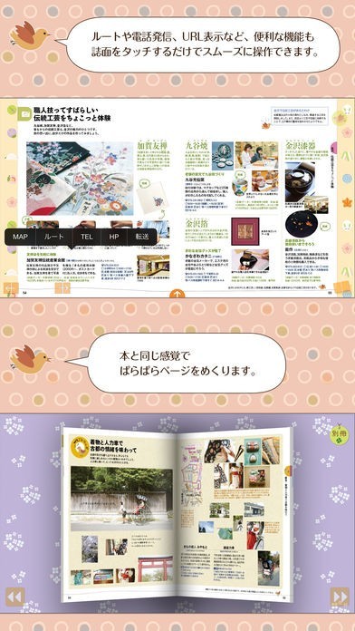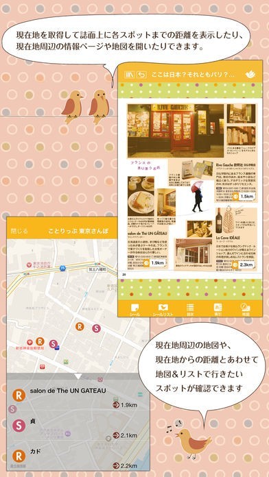 アプリ「ことりっぷ電子ガイドブック - 週末に行く、2泊3日の小さな旅を提案します。」では、国内外の観光地の数々に関する観光情報、グルメ情報などを1冊にまとめた女性に大人気の旅行小冊子「ことりっぷ」のコンテンツをスマートフォンで読むことができるだけでなく、GPS機能を活用してガイドブックに掲載されているスポットから現在地までの距離を測定し、実際に旅行に行ったときのナビとしても役立てることができます。旅行に行く前には気になるページを読んでシールを貼っておけば、当日行きたい場所をカンタンにリスト化することもできるので、当日何度もガイドブックをめくる必要もありません。