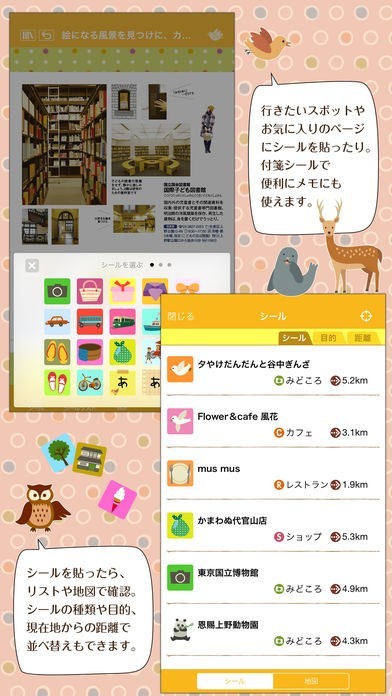 アプリ「ことりっぷ電子ガイドブック - 週末に行く、2泊3日の小さな旅を提案します。」では、女性を中心に高い人気をほこっている、小旅行にフォーカスした旅行ガイドブック「ことりっぷ」の内容を、電子書籍ならではのコンテンツとともに読むことができます。たとえば、旅行の計画を立てながらじっくりガイドブックの内容をチェックして、行きたいところにシールを貼っておけば、旅行当日にはGPS機能を活用して現在地からその場所までの距離を表示させることも可能です。