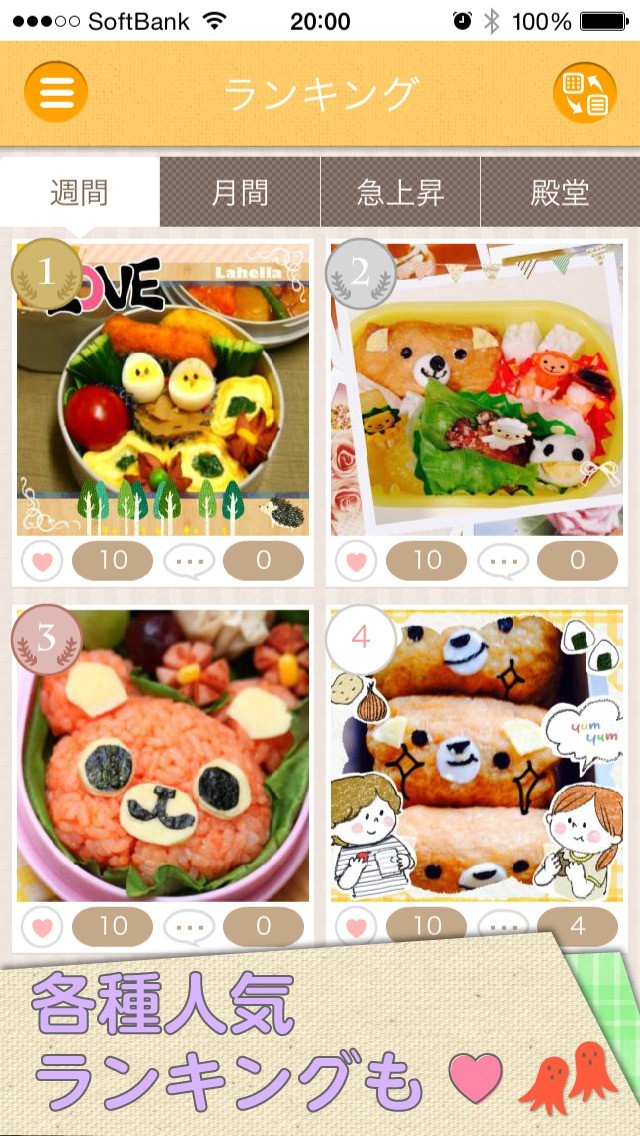 気になるキャラ弁が満載、豊富なランキング機能充実で、キャラ弁作りを楽しみたい方に最適