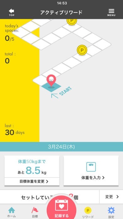 運動の目標を設定をしたり、毎日の体重と体脂肪を記録することができます。運動を毎日継続していると、アクティブリワードによってポイントをゲットするチャンスもあります。
