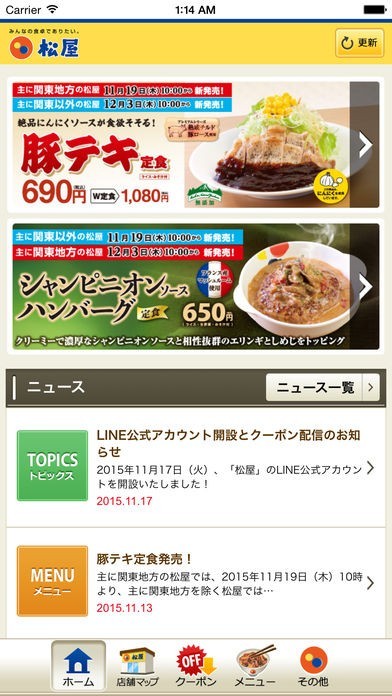 「松屋フーズ公式アプリ」にはメニュー機能が付いています。 どんなメニューが揃っているのか、価格は幾らなのか来店する前にチェックしておくと便利です。 新しいメニューが登場した時にはニュース機能にてすぐに分かるようになります。 新しいものが好きという食通の方に便利な機能です。 その他にも期間限定のメニューも届くのが魅力の一つとなっています。 お得な価格でメニューを楽しみたい時はクーポン機能を利用します。 クーポン期間中に来店すると対象メニューがお得になります。 店舗が何処にあるのか分からない時に使えるのが店舗マップ機能です。 スマホに表示された地図の上に店舗のアイコンが出てくるため、事前にチェックしておくと来店がスムーズです。
