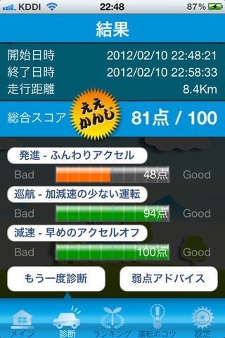 運転シーン(発進・巡航・減速)ごとに診断し、100点満点で採点します。