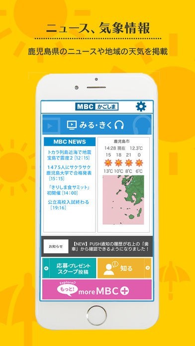 スマートフォンで南日本放送が提供する天気予報やニュースを閲覧することができるアプリとなっていて、桜島の噴火情報など地域に密着した情報をチェックすることができます。