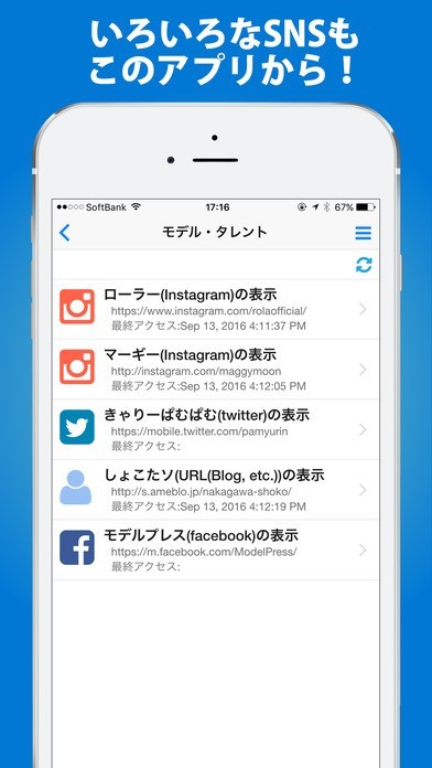 「SNS HUB」は複数のSNSサービスを利用しているタレントや友達の投稿をまとめてチェックするためのアプリです。InstagramやTwitterなどのアカウントのURLをブックマーク的に登録したり、フォルダー分けして整理したりすることができます。トップ画面のフォルダー一覧では、登録したアカウントのSNSの種類がアイコンとフォントの色分けで表示されるので識別しやすく、最後にアクセスしたのがいつかも表示されるので未読がたまり過ぎることもありません。