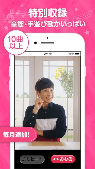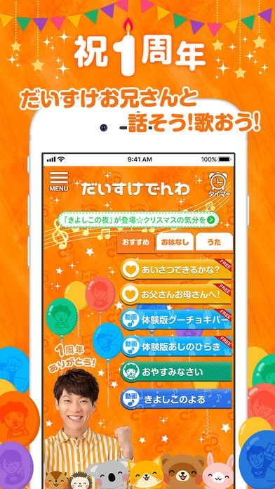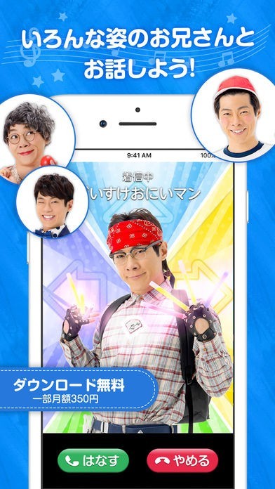 子どもが大好きな「おかあさんといっしょ」11代目うたのおにいさんであるだいすけお兄さんから電話がくるアプリです。電話だけでなく、だいすけお兄さんの歌声を聞くことができます。歌はこのアプリの為だけに収録しただいすけお兄さんが歌っている姿を見ながら聞くことができ、様々なキャラクターになりきることが上手なお兄さんが、様々なキャラクターで登場してくれます。電話の内容は毎月変わるので飽きることがありません。だいすけお兄さんの声と歌声に癒されるアプリです。