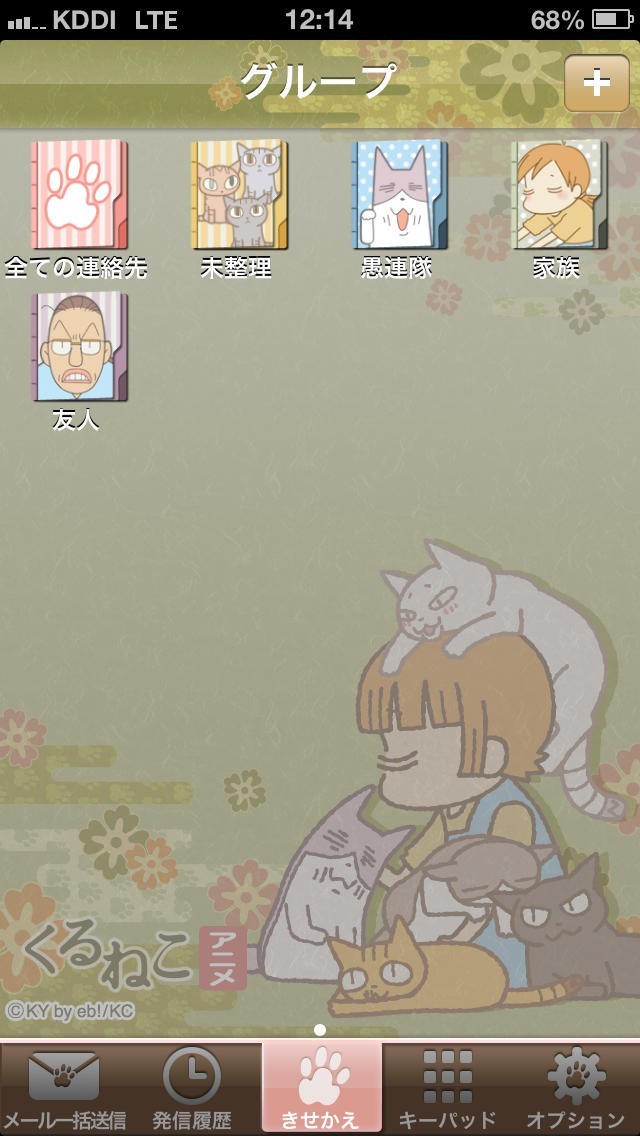 大人気アニメの"くるねこ"のデザインに電話帳の着せ替えができ、連絡先のグループ管理機能で一斉送信が可能に