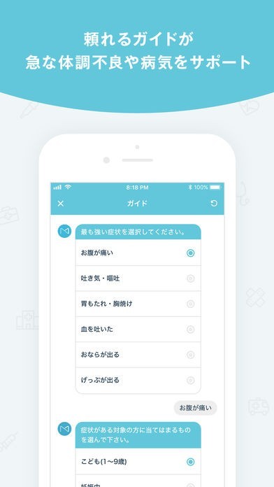 からだに異常を感じたら、気になる症状があるときはガイドに聞いてみよう。あなたの症状に合わせて必要な対応やどんな病院に行けばよいのかを教えてくれます。また、急な病気やけがをしたときにも便利です。