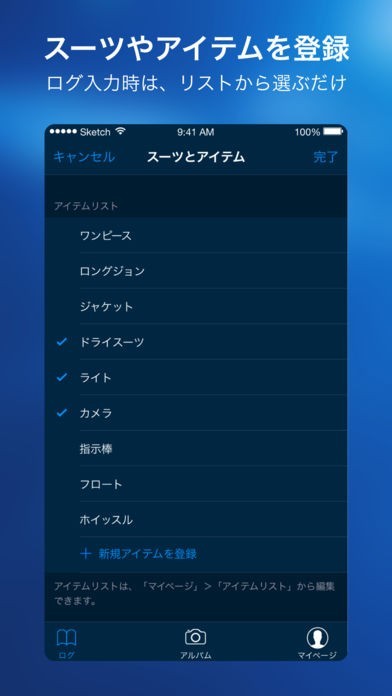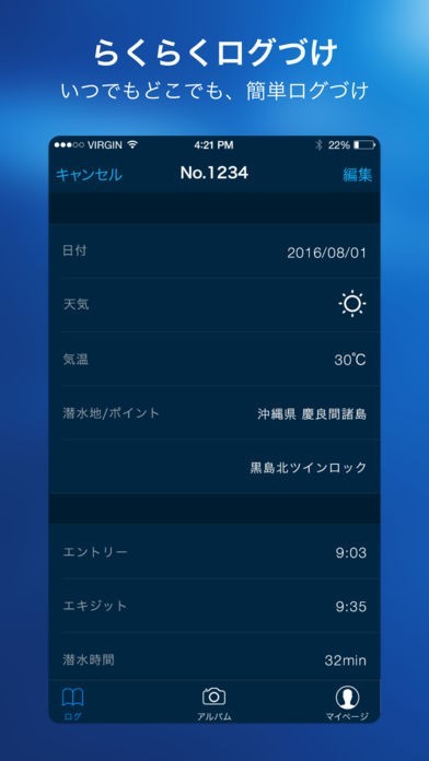 App Storeより引用無料で使える、スキューバダイバーのためのログブックアプリ。さくさく手軽にログづけを楽しみましょう。