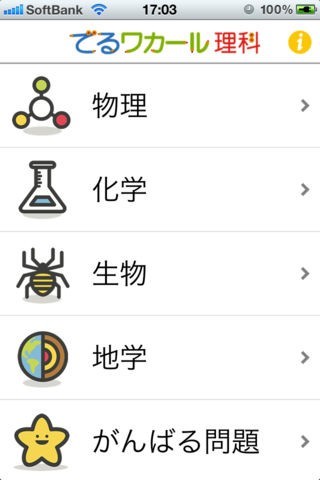 物理・化学・生物・地学の全範囲が、このアプリ1つでいつでもどこでも学習できます。よく出題される図やイラスト、グラフなども取り入れました。基礎から標準レベルの問題はこれで完璧です。暗記の仕上げや総復習にどうぞご活用ください。