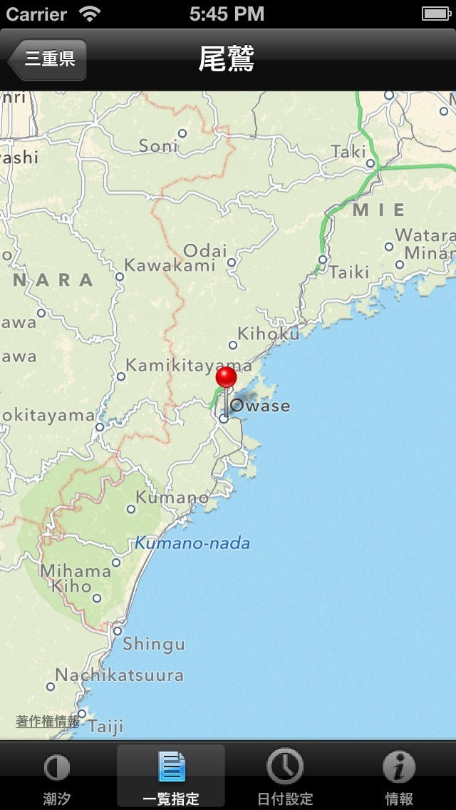 また釣り場は一覧から選択しますが、青い丸(一覧の右端)をタッチすると地図を表示します。