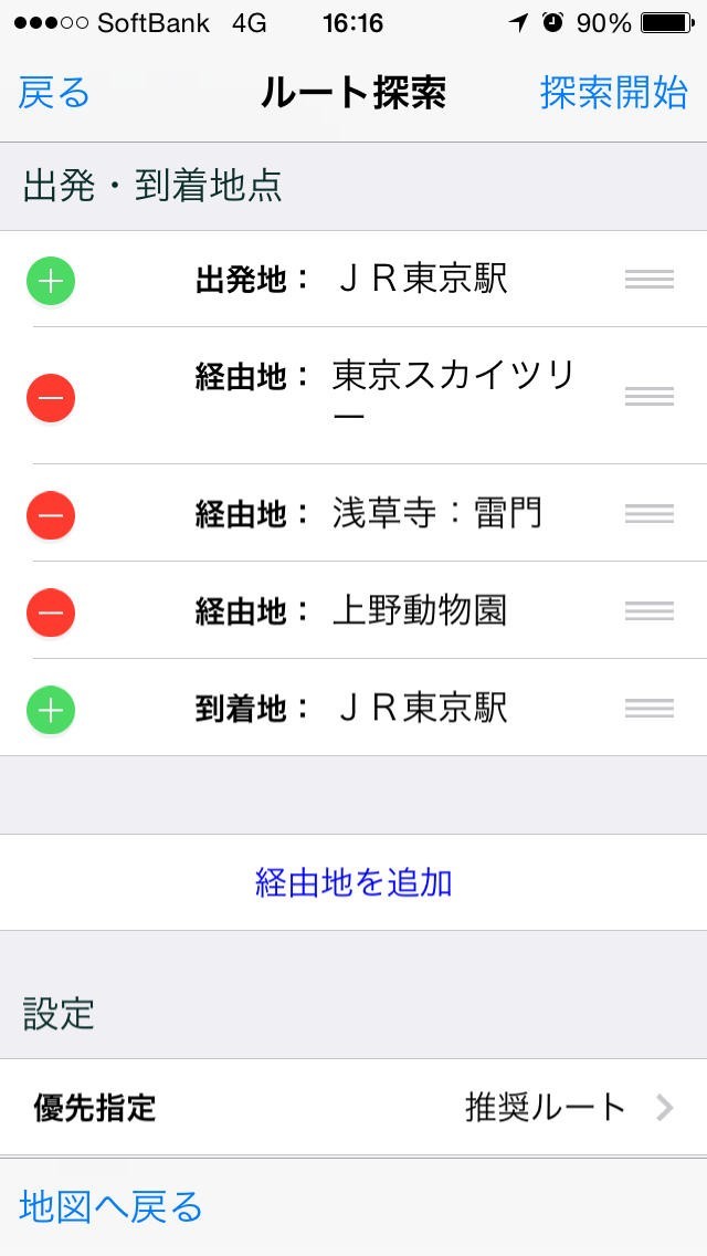 ・目的地・経由地を合わせて、最大11箇所設定してルート探索