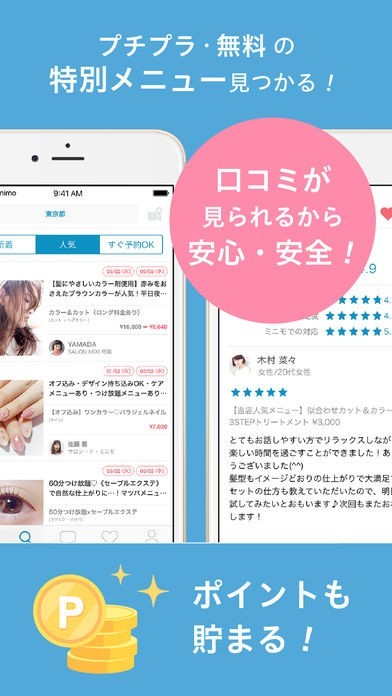 無料の美容室を予約できたり、美容師さんの腕など書かれていて安心して予約できる。金額から地域まで絞って検索できるからとても便利!