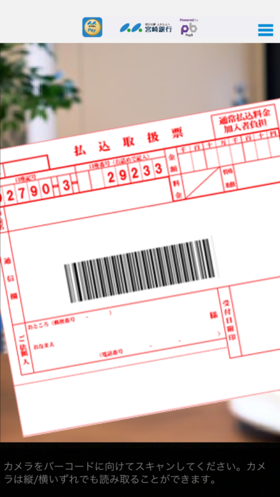 ・コンビニ払込票のバーコードを読み取ることで、あらかじめ登録した宮崎銀行の預金口座からさまざまな代金を直接お支払いただけるスマートフォンアプリです。