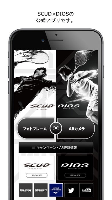 スポーツメーカーミズノのソフトテニスラケットの「SCUD」と「DIOS」の公式ARアプリです。SCUDとDIOSの機能や詳細な説明が分かるだけでなく、フォトフレーム機能を使えば SCUD×DIOSのロゴが入った写真を撮ることができます。公式のYOUTUBEへアクセスできたり、ミズノテニスtwitterにも直接アクセスし、最新情報を得ることができます。また、AR機能が搭載されており、ARカメラでSCUDやDIOSの商品を撮影すると特別映像や限定キャンペーンへ応募することができます。ミズノ、ソフトテニス、SCUDやDIOSのファンにはピッタリ、満足できる公式アプリとなっています。