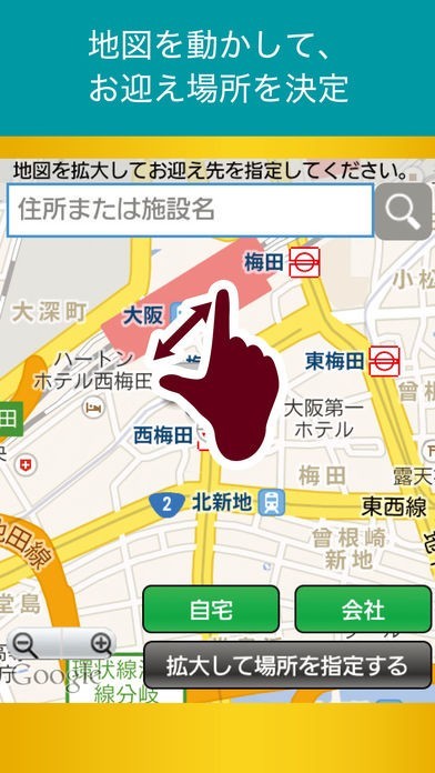 地図を使ったお迎え先の指定機能を搭載!出張先で利用したいビジネスマンにもお役立ち!
