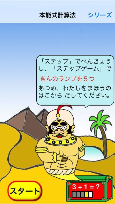 ランプの精を助けるために金のランプを5つ集めるというステップゲームが搭載されているので、ゲームをしているように勉強を楽しめます。他の動物と計算スピードを競うゲームになっています。