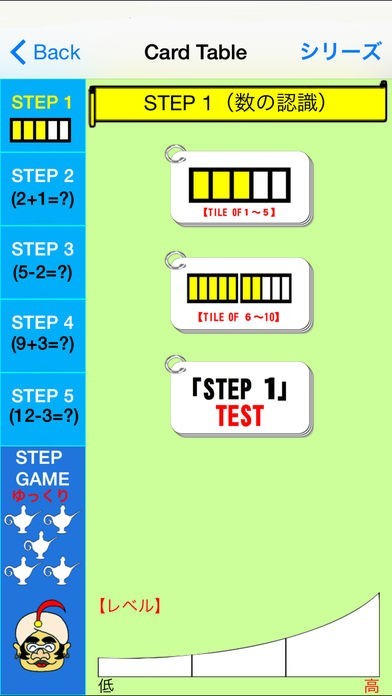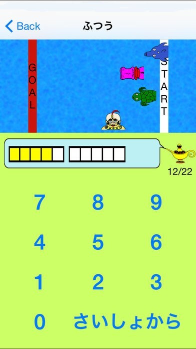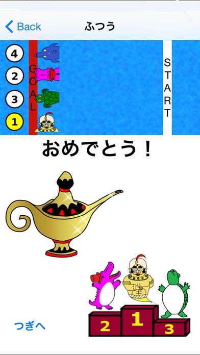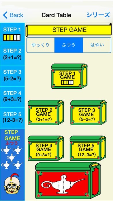 問題を学習したら、いよいよ実践のステップゲームです。ステップゲームでは、魔法の箱に閉じ込められたランプの精を助けるために、3匹の動物と競争して、5つの問題を解いて金のランプを集めます。対戦相手のスピードは3つから選択が可能なので、お子さんの成長に合わせた難易度に出来るので、習熟度の把握に役立ちます。また、金のランプを集めると様々なシーンが見れる楽しみもあり、意欲の向上が期待できます。