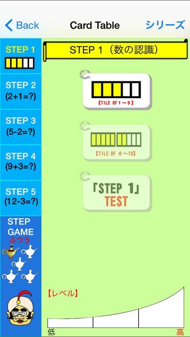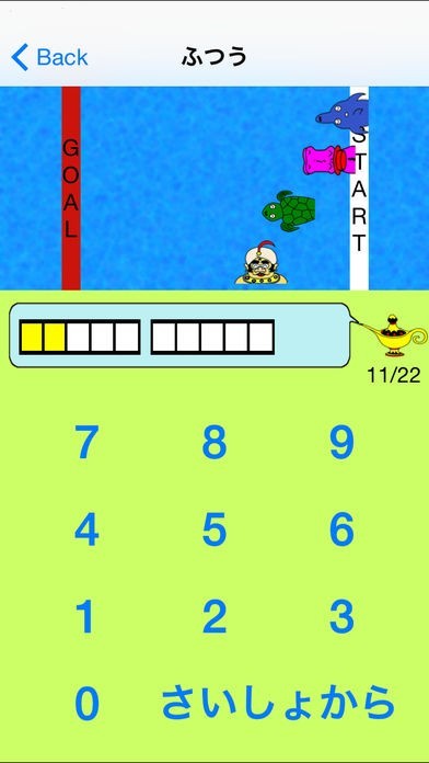 指を折って計算している子供に指を使わずに計算できるようにするための学習ができる『たす・ひく Free』は「本能式計算法」と呼ばれる方法を用いて本能に沿った学習ができるアプリになっています。最初は黄色いタイルを見て視覚で数を認識するところから始められるので数の概念が無い幼児期からの学習もできるようになっていて、ステップが用意されているので段階的に算数の基礎から学ぶことができます。数字に慣れてきたら次のステップである「繰り上がりの無いたし算」はレース形式で問題を解いていくゲームになっていて速さを選ぶことで難易度を設定できるので子供に合ったレベルで遊びながら算数学習の基礎を学ぶ事ができます。