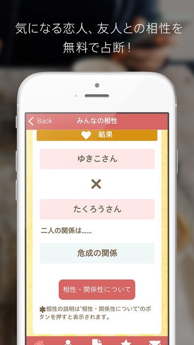 ◆「みんなの相性」:気になる恋人、友人との相性を占断! 友達同士の相性を占ってあげることもできます。<無料>