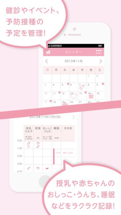 赤ちゃんの1日の行動(食事、尿・便などの内容や時刻)を記録したり、赤ちゃんの身長・体重の推移を管理したりできます。