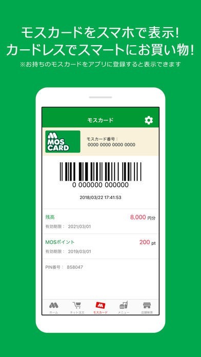 手持ちのモスカードの情報をアプリに入力することによって、カードを持ち歩かなくてもアプリの画面を提示することによって店舗でモスカードを利用することが可能となっています。