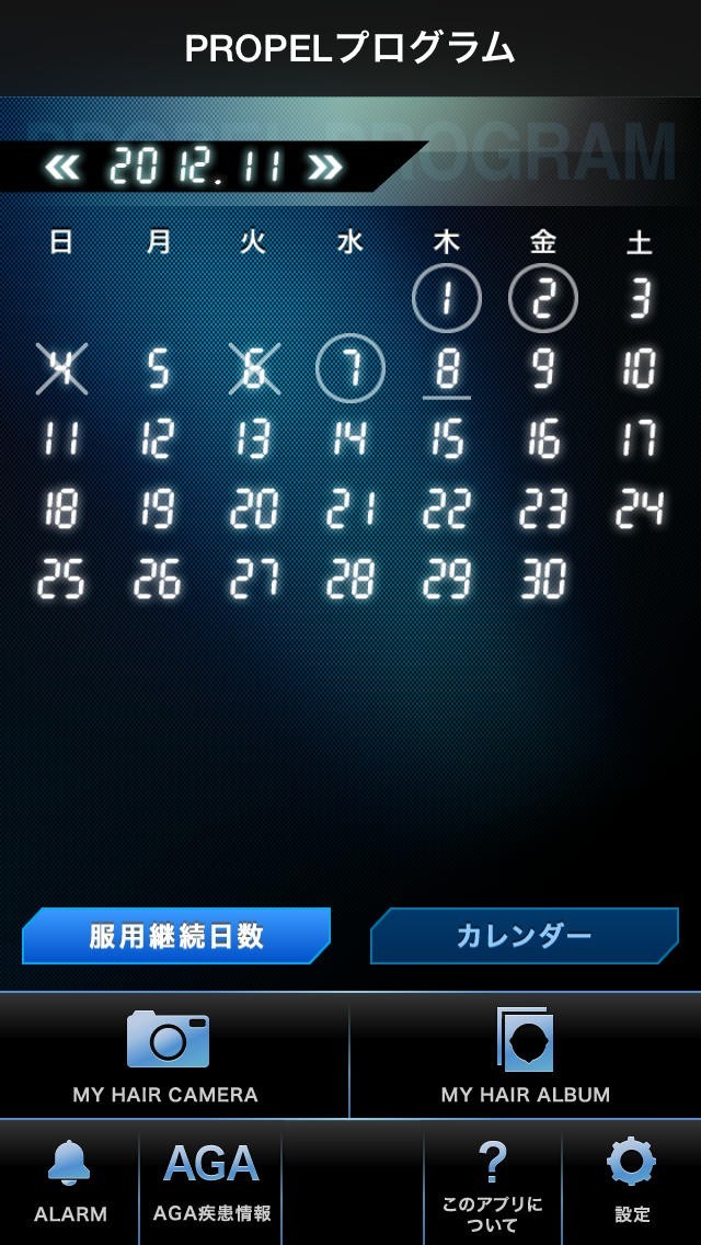 「PROPELプログラム」は、薄毛治療をしている方が頭頂部の写真を定期的に撮影することによって効果を把握することが出来ます。 アプリのトップ画面には服用継続日数がカウントされているので、どのくらい使ったのかを一瞬で把握することが可能です。 「MY HAIR CAMERA」から撮影が出来ますが、線が目安として表示されるので、頭頂部が良く見えないといった事態を避けることが出来ます。 それらは、「MY HAIR ALBUM」で日にちごとに確認できるので、何日頃に効果が見られたかなどを確認できます。 他にもアラーム機能を活用して、病院に行き忘れるといったことも無くすことができ、継続して治療を続ける助けとなります。