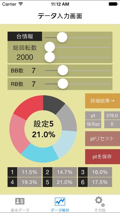 このアプリでは総回転数・BB数・RB数を入力し,台の設定判別が可能となっています.
