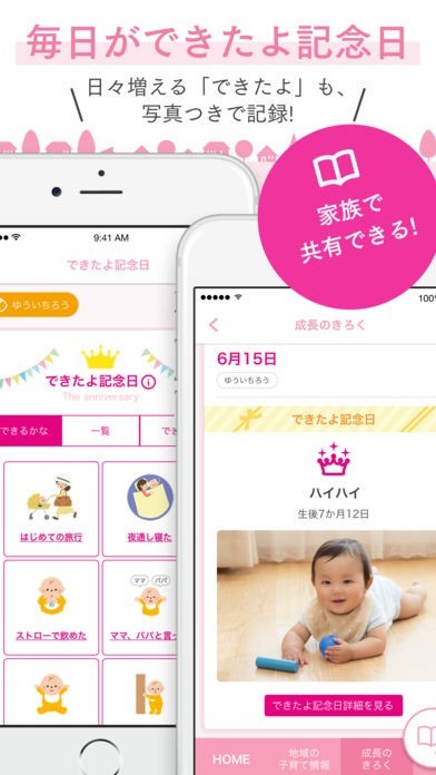 「伝い歩き」などお子さまの「できたよ」を写真つきで残せます。