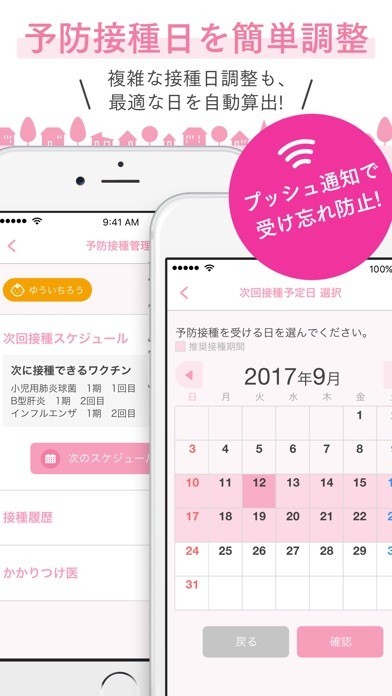 出生日と実際の接種日に応じて最適接種時期を自動で算出し、予定日が近づくと事前にお知らせします。