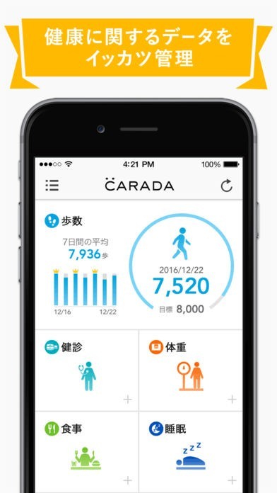 「CARADA」は、健康についてのデータを一括管理する管理アプリです。 記録機能を搭載しており、歩数や睡眠、血糖値、体重などの記録が可能。 記録したデータを選んでトップ画面に表示することもできるなど、自分に合わせて使いやすくカスタマイズできるのも便利なポイントとなっています。 お薬手帳機能を利用すれば処方された薬の管理が楽になる他、健康診断結果を読み取り、データとして管理が行えるのも特徴です。