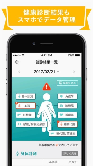 健康診断結果を登録し、データとして管理することができます。それぞれの部位の数値に対する危険度や解説なども表示可能。データとして見直すことで、健康診断結果をあらためて把握することができるでしょう。