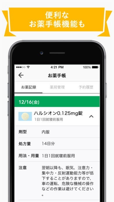 お薬手帳機能搭載!処方された薬の名称などを楽々管理!