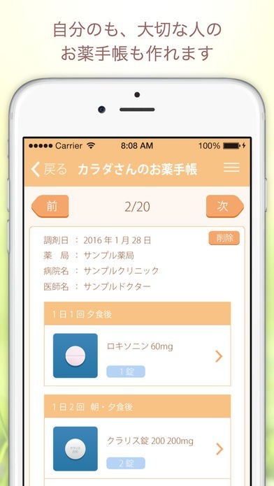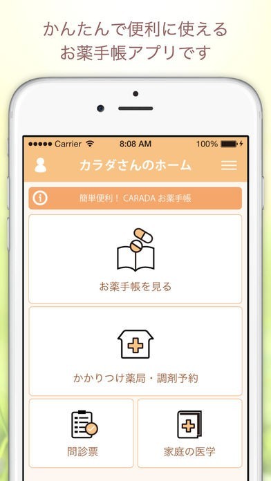 CARADA お薬手帳はスマートフォンをおくすり手帳として使うためのアプリです。通院などで処方箋が必要な薬局に通っている方やお子様がいらっしゃる方にはおくすり手帳を忘れることが防げることや、複数の家族のおくすり手帳をこのアプリひとつで代用できるため非常に便利なアプリです。調剤薬局での提出がメインの使用となりますが、処方された薬の情報についてより詳しく知りたいときなどにも紙の処方箋以上の情報が掲載されているため、日常でも使うことが出来ます。おくすり手帳は複数の通院時により重要性を増しますが、このアプリを使った場合紙のおくすり手帳と違ってページがかさばることがなく長い間使うことができるというところもメリットです。