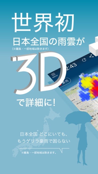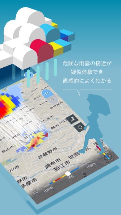 スマートフォンで雨雲の様子を3Ⅾで表示することができるアプリとなっていて、雨雲の発達の様子や降水量などを直感的で分かりやすい3Dでチェックすることが可能となっています。
