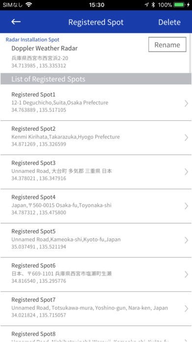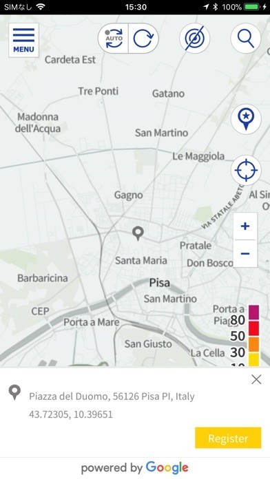 地図から場所を指定するか、緯度経度検索で任意地点の登録ができます。