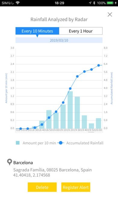 登録地点における、過去72時間分の累積雨量や、10分ごと/1時間ごとの雨量をグラフで確認できます。