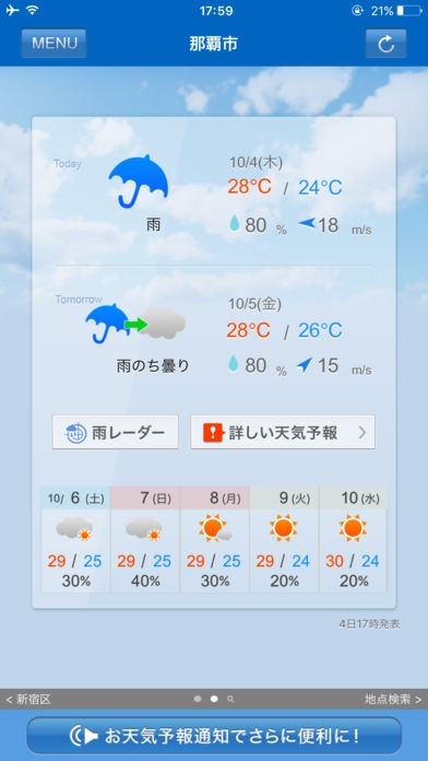 天気が急に変わった時や天気の情報をプッシュ通知で知らせてくれるのが便利で役に立ちました。