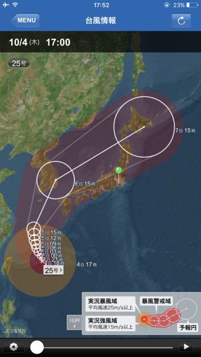 気温や降水確率などの基本的な天気予報だけでなく、台風の発生場所やその動向、地震の震源地やマグニチュード、津波の予測やその大きさ、発表されている警報や注意報の確認などありとあらゆる気象情報をこのアプリ1つで得ることが出来ます。また、雲や台風の動きはアニメーションで確認出来るので状況を一目で把握することが可能です。