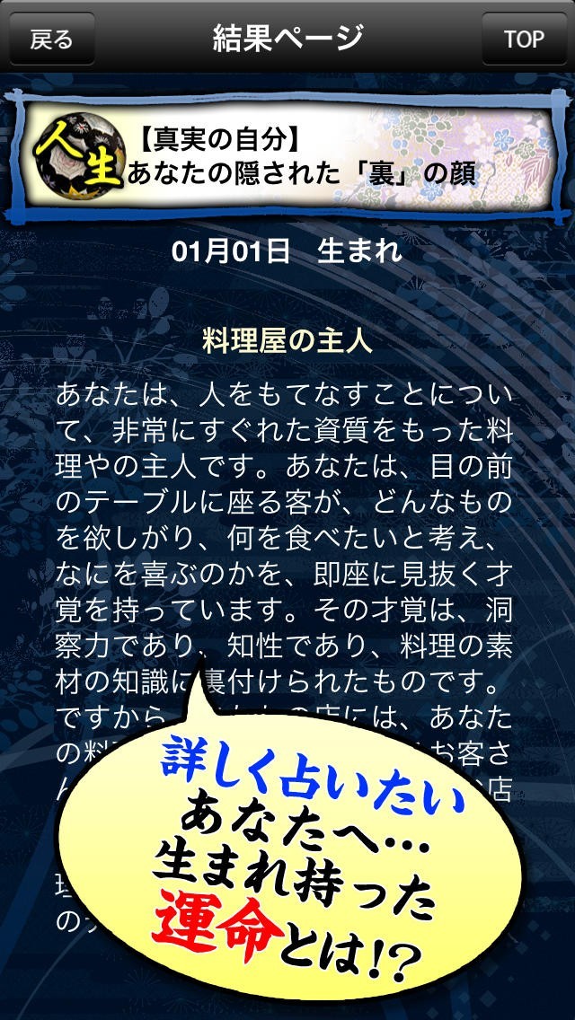 自分の生まれた日にはどのような意味があるのだろうと疑問に思っている方にピッタリのアプリが「激的中!365日運命大暦」です。暦を分析した結果により、自分の性格を分析したり、どのような職業が向いているのかを説明してくれます。また、自分を運命の人のもとへと導いてくれるのです。さらに、自分の将来の出会いや結婚、人生の転機を教えてくれる少し先の鑑定も行ってくれます。江戸時代から続いている暦に関する学問を利用しているため、オカルト的な占いではなく確かなデータに基づいた暦占いに興味があるという方にとっては必見です。日々の吉凶を占うカレンダーもついています。